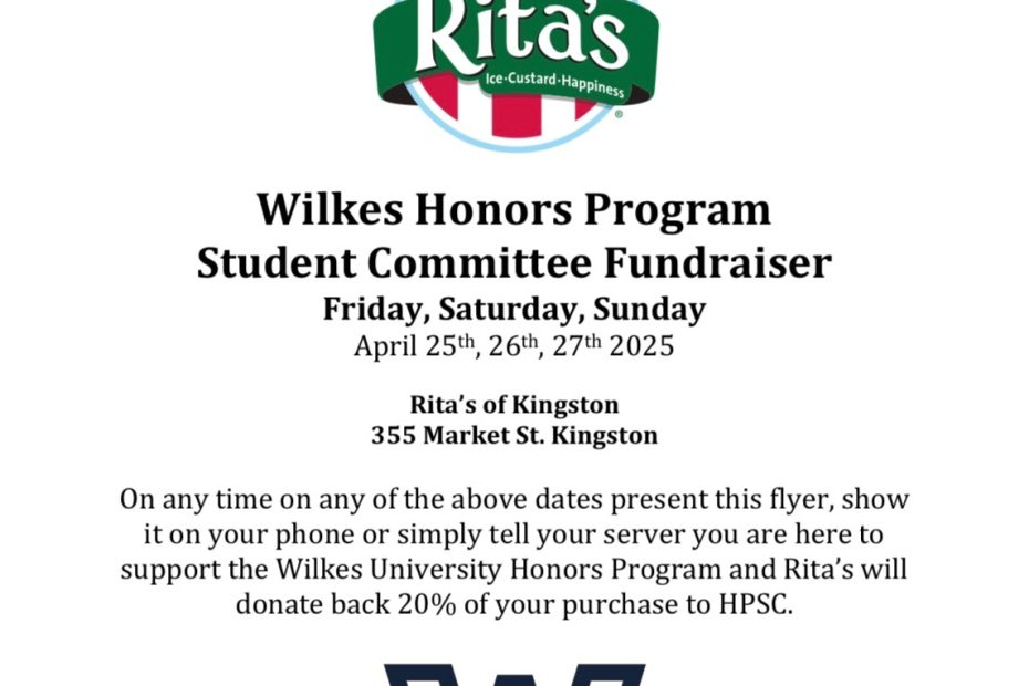 The Honors Program Student Committee is holding another fundraiser at Ritas! From this Friday, April 25th to Sunday, April 27th at anytime during working hours, present this flyer, show it on your phone, or simply tell your server you are there to support the Wilkes University Honors Program and Rita’s will donate back 20% of your purchase to HPSC! The correct address is 355 Market St. Kingston, and thank you for your support!