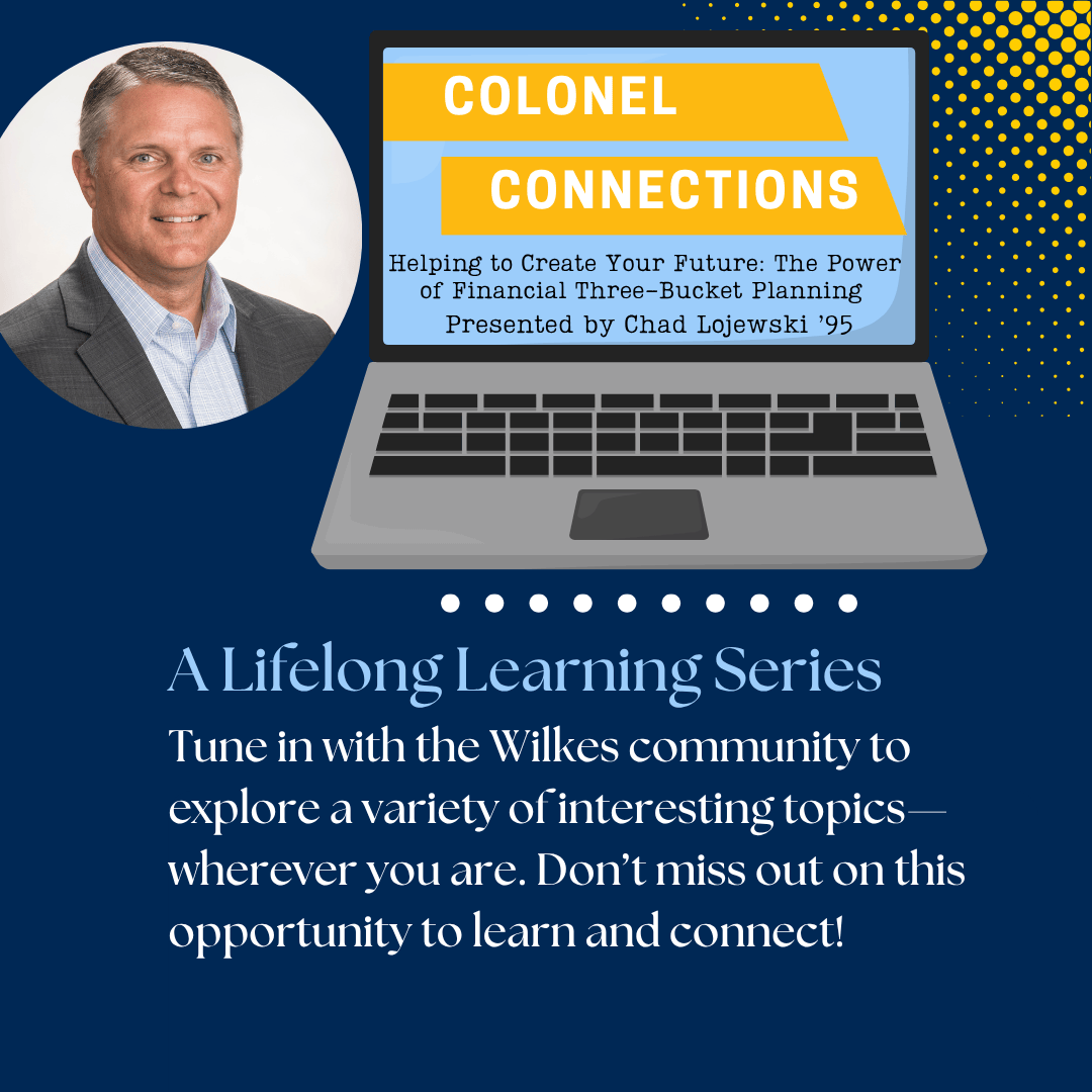 Join our fifth Colonel Connection webinar on August 27 at 12:00pm, where we will be discussing “Helping to Create Your Future: The Power of Financial Three-Bucket Planning,” led by Wilkes alum Chad Lojewski ’95. Chad will walk us through an appx. 30 minute presentation that will focus on helping you to create your future by using the power of a simple 3-bucket financial planning approach. After the presentation, he will take your questions about anything financial planning related.