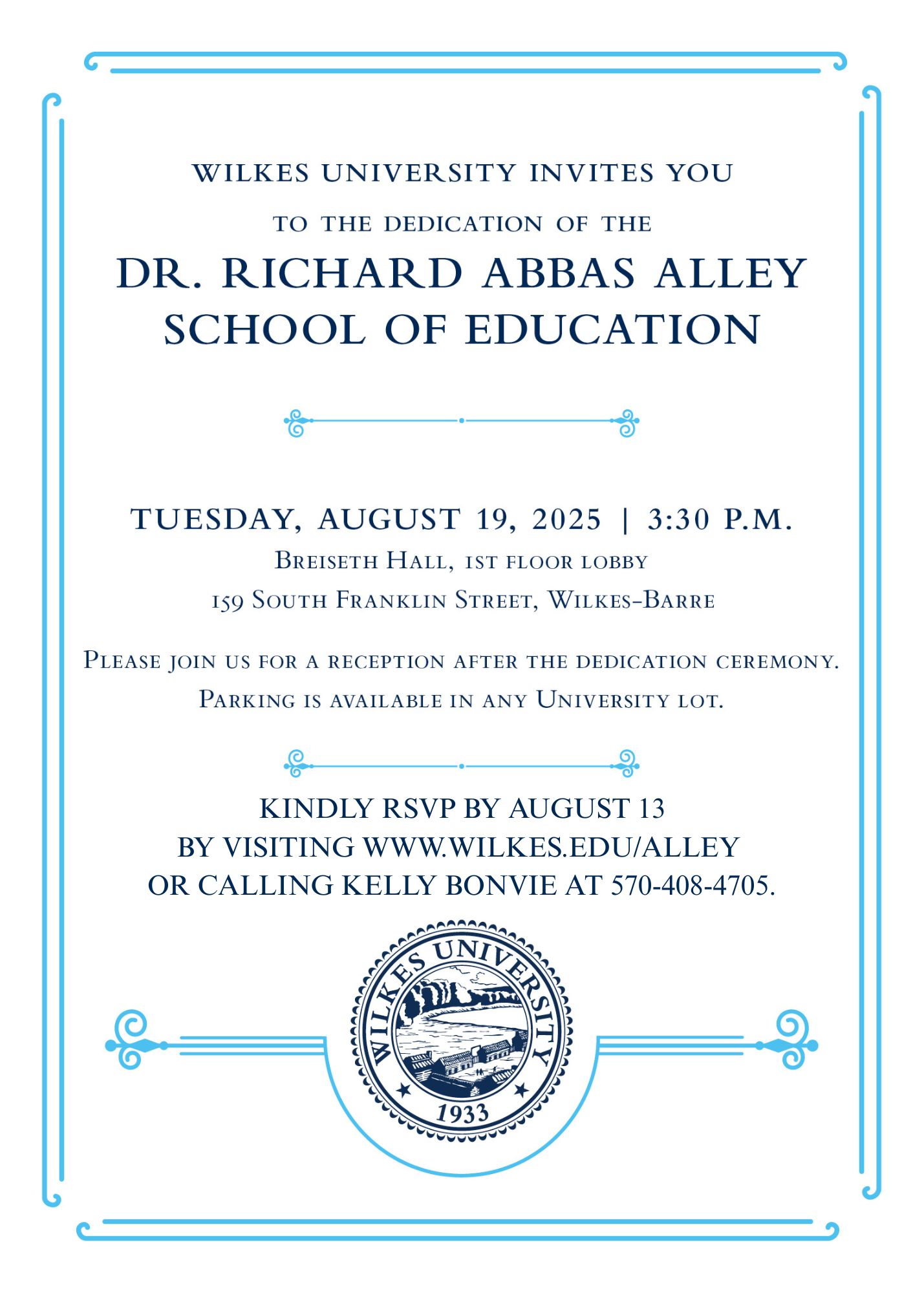 Members of the campus community are invited to the dedication of the Dr. Richard Abbas Alley School of Education at 3:30 p.m. on Tuesday, August 19. The ceremony and reception will take place on the first floor of Breiseth Hall. Let us know you plan to attend by visiting www.wilkes.edu/alley.