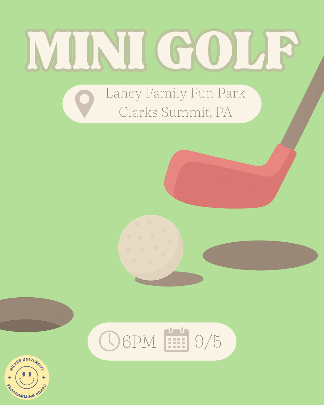 Join Programming Board on September 5th, at 7 PM in the SUB to go to Lahey Family Fun Park for an evening of mini golf and go karts. Compete with and against your friends to see who can get the lowest score