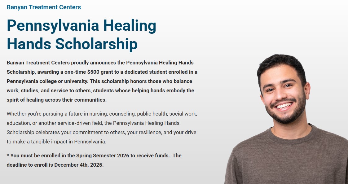The Pennsylvania Healing Hands Scholarship. It’s a $500 award offered each semester to Pennsylvania students in service-focused fields, with the application deadline on December 4, 2025. You can find more information at the following website. https://www.banyantreatmentcenter.com/resources/pennsylvania-healing-hands-scholarship/