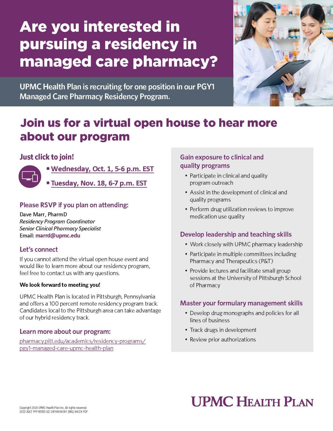 Virtual Open House for UPMC Health Plan PGY1 Managed Care Residency Program