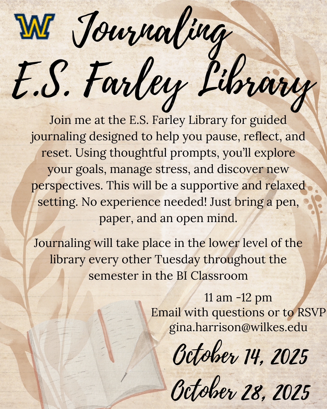 Join me at the E.S. Farley Library for guided journaling sessions designed to help you pause, reflect, and reset. Using thoughtful prompts, you’ll explore your goals, manage stress, and discover new perspectives. Journaling will be held in a supportive and relaxed setting. No experience needed! Just bring a pen, paper, and an open mind. The journaling group will take place at the lower level of the E.S. Farley Library every other Tuesday throughout the semester from 11 am until 12 pm in the BI Classroom. Journaling sessions begin October 14, 2025.