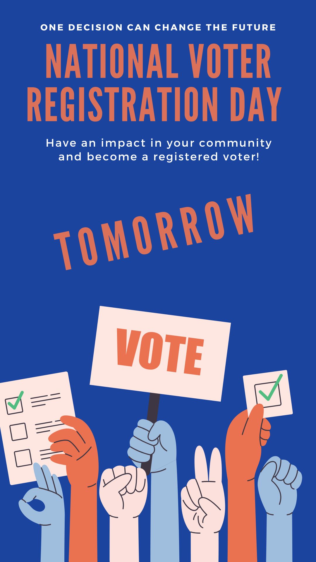 Tomorrow is national voter registration day! Stop by the SUB from 11:00 a.m. – 1:00 p.m. to talk with a representative from the bipartisan organization League of Women Voters to learn more about the registration process and what you need to do to be registered correctly.