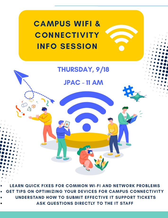 Frustrated with dropped connections, slow speeds, or log-in errors? Join the IT team for a student-focused info session designed to: