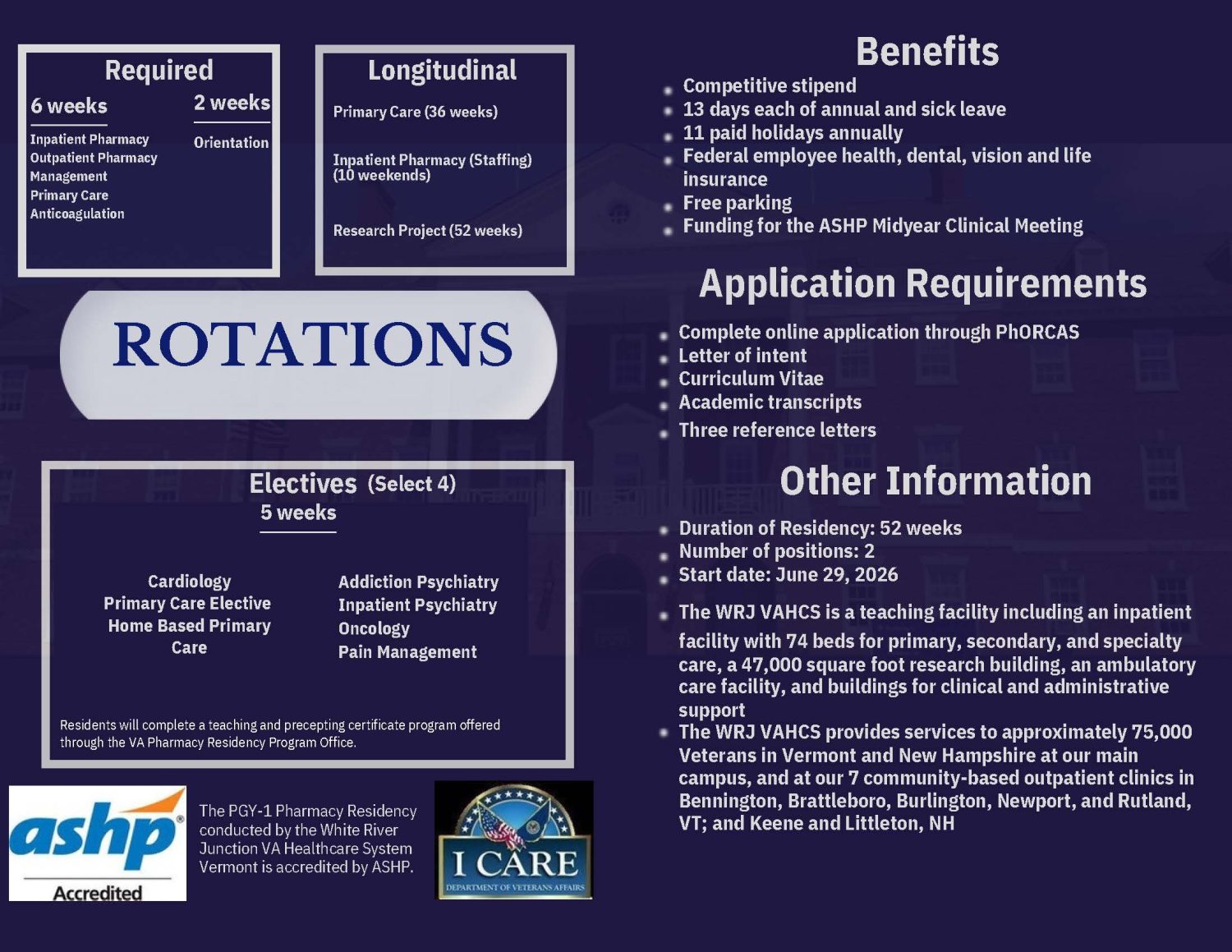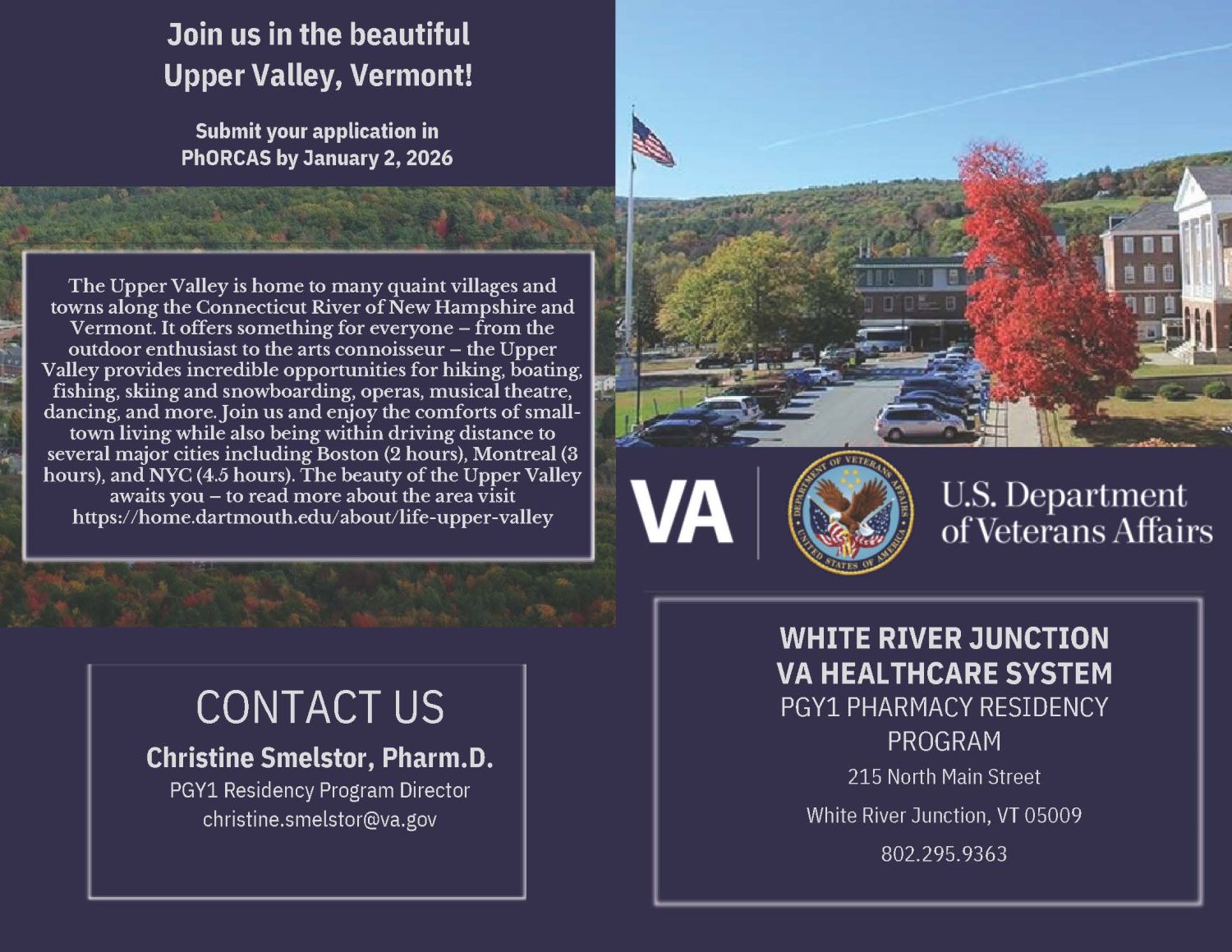 The White River Junction Veteran Affairs Healthcare System in White River Junction, Vermont is pleased to announce that we will be accepting applications for TWO Post-Graduate Year One residents for the 2026-2027 residency year! Our team is comprised of highly qualified pharmacists coming from diverse backgrounds, who will provide our residents with the experience and support they need to flourish in their PGY1 year and beyond. We are an ASHP-accredited program with a strong track record of developing successful clinical pharmacists. Our graduates have pursued PGY-2 specialty training and secured positions as full-time clinical pharmacist practitioners both within the VA and in external healthcare systems.