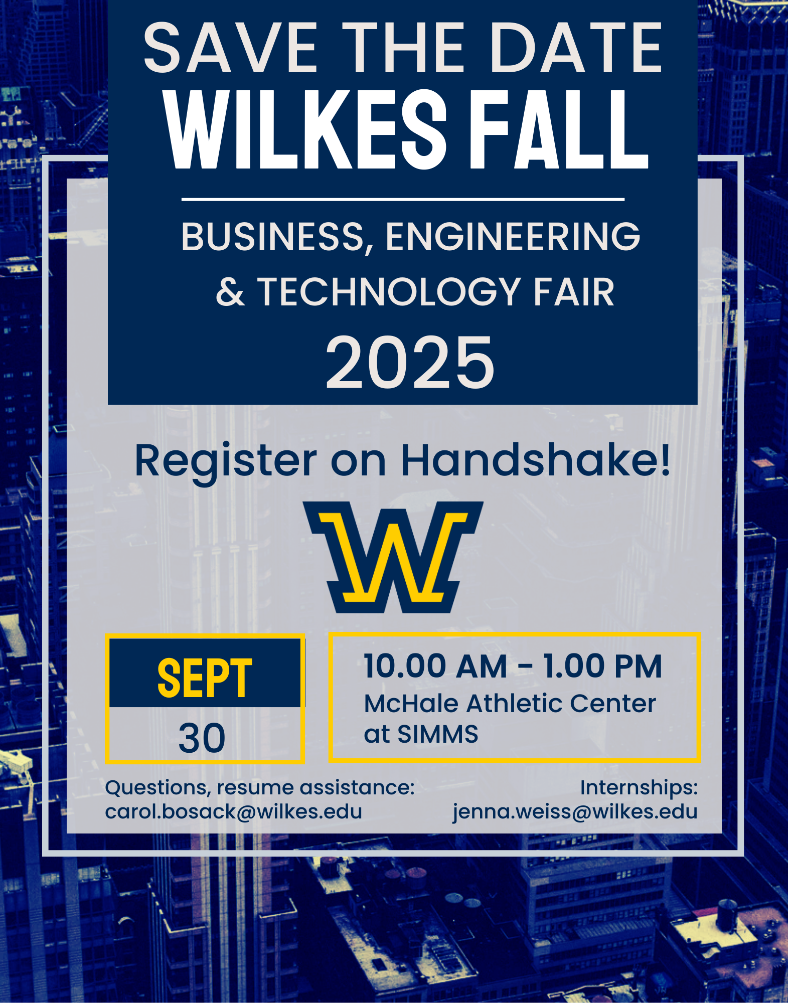 Join us on Tuesday, September 30th from 10:00-1:00 in the MAC for our Fall Business, Engineering & Technology Career, Internship, and Grad School Fair!
