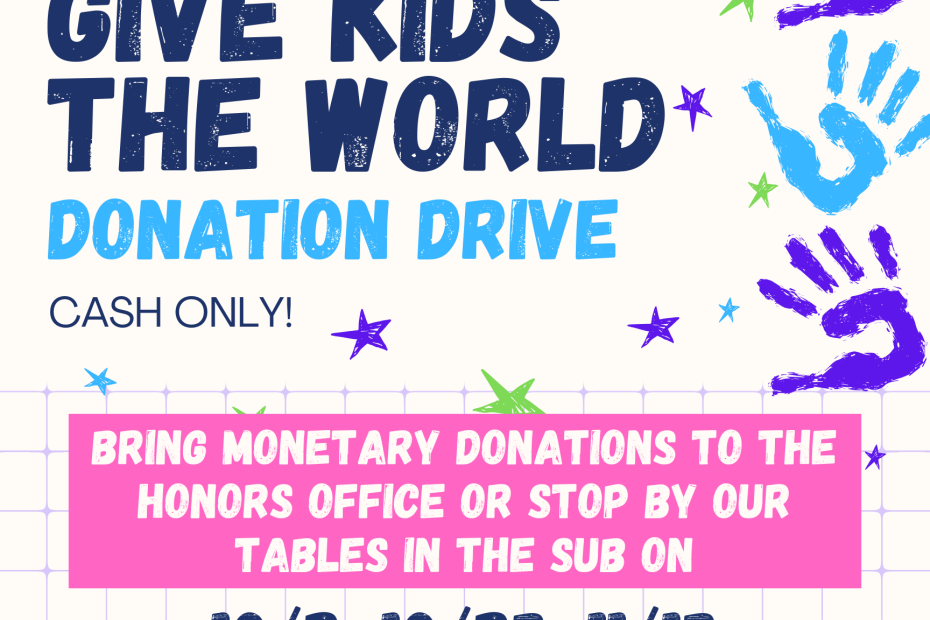 The Honors Program is collecting cash donations to benefit Give Kids The World, a nonprofit that provides memorable vacations for children with critical illnesses and their families. Every dollar makes a difference in helping these kids experience joy and hope.