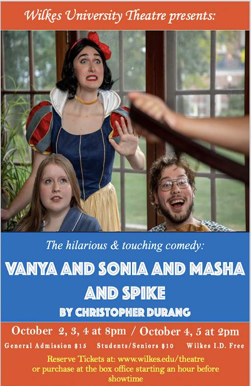 Wilkes University Theatre presents the comedy-drama “Vanya and Sonia and Masha and Spike” by Christopher Durang; October 2, 3, 4, at 8pm and October 4, 5 at 2pm. The story: Siblings Vanya and Sonia enjoy a quiet life in their family’s Bucks County farmhouse—until their glamorous, movie-star sister, Masha, bursts in with her much-younger, hunky boyfriend, Spike. As old grudges resurface and outrageous surprises unfold, this dysfunctional family navigates their past, future, and each other in the most absurdly funny ways. Get ready for plenty of laughs, unexpected twists, and a little bit of chaos! And also enjoy our newly renovated lobby! Purchase your tickets at www.wilkes.edu/theatre today!