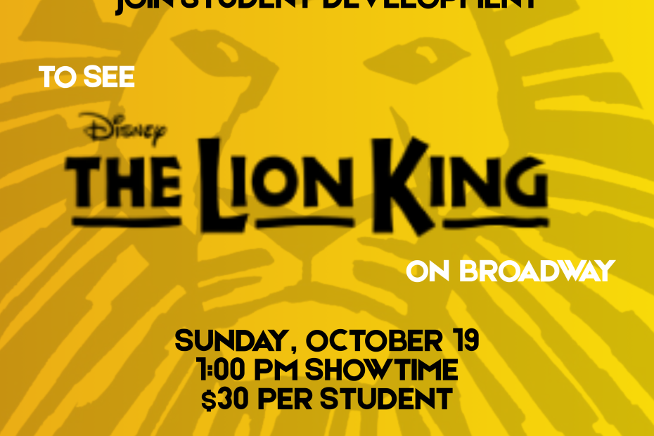 Join Student Development to see The Lion King on Broadway in New York City! The trip is scheduled for Sunday, October 19 with transportation and ticket included! Stop by the info desk to reserve your spot – first come first serve. Cost is $30 per student and Wilkes ID and payment are due at time of sign up.