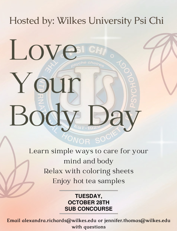 Join Psi Chi on Tuesday, October 28th (11 a.m. – 1 p.m.) in the SUB Concourse to celebrate Love Your Body Day! Take a moment to slow down, de-stress, and focus on your well-being. Relax with coloring sheets, enjoy hot tea samples, and pick up mental health screening cards that connect you with free, anonymous resources through the Counseling Center. Learn simple, meaningful ways to support both your mind and body—and give yourself a well-deserved break during a busy week!