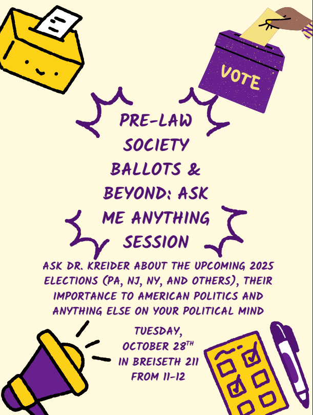 Join Pre-Law Society for Ballots & Beyond: Ask Me Anything Session. Ask Dr. Kreider about the upcoming 2025 elections (PA, NJ, NY, and Others), their importance to American Politics, and anything else on your political mind! It will take place on Tuesday, October 28th, in Breiseth 211 from 11-12