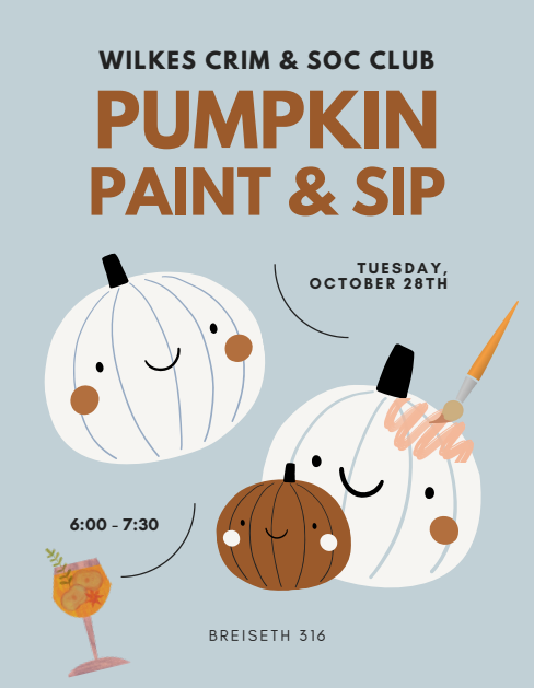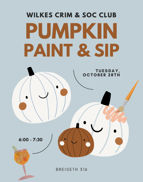 Join Wilkes Crim & Soc club for a pumpkin paint and sip tomorrow, Tuesday, October 28th! It will take place in Breiseth 316 from 6-7:30 pm. We hope to see you there!
