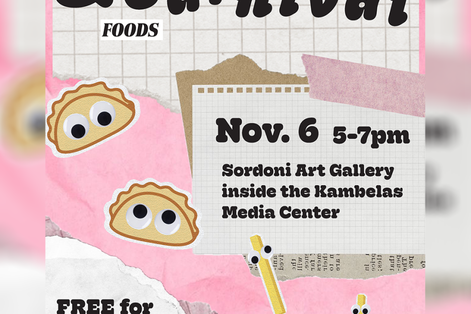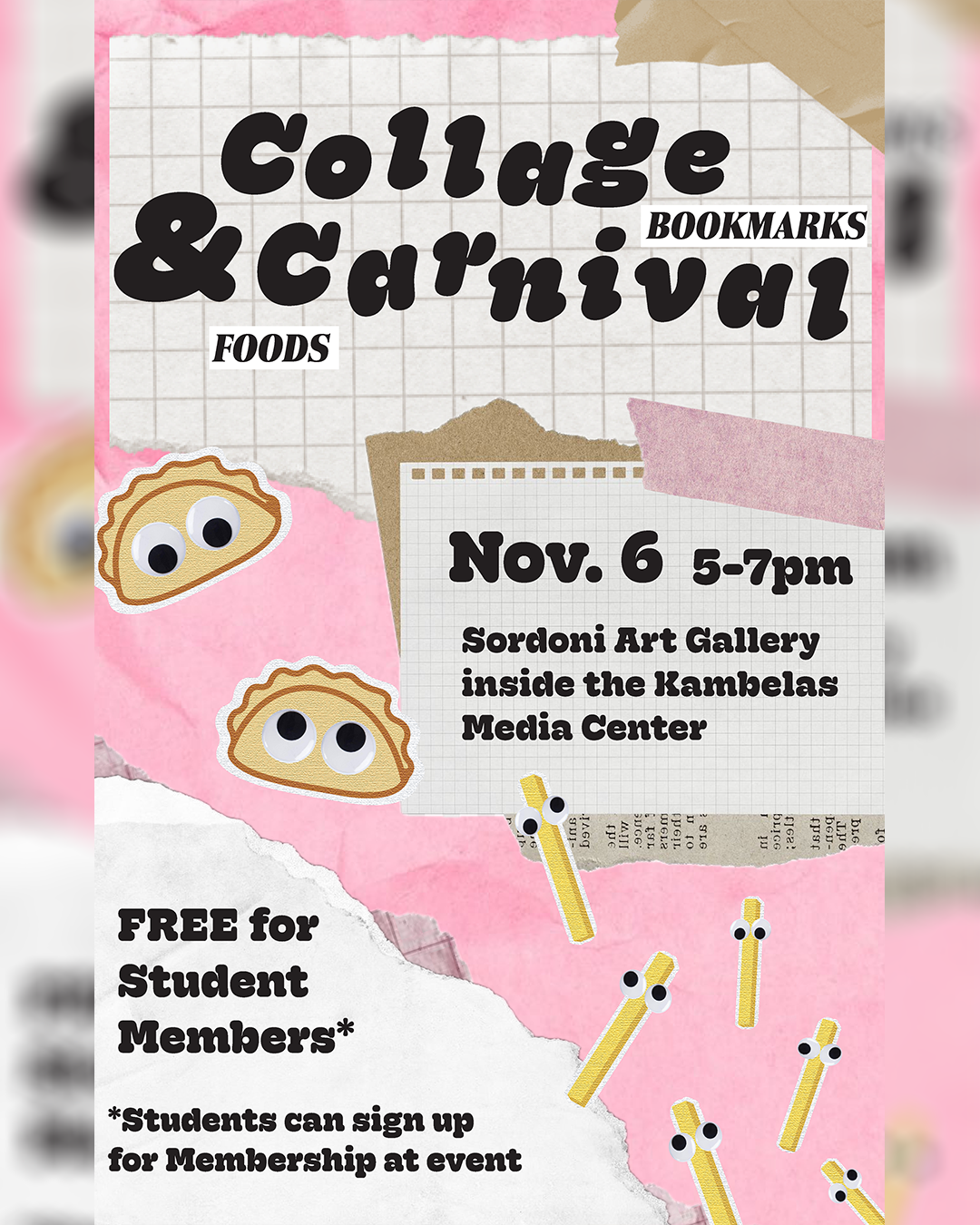Tues. 11/4, from 5 to 7 pm at the Sordoni Gallery. Enjoy carnival favorites like potato pancakes and create collage bookmarks! This event is for Student Members! (membership is free, you can sign up at the event)