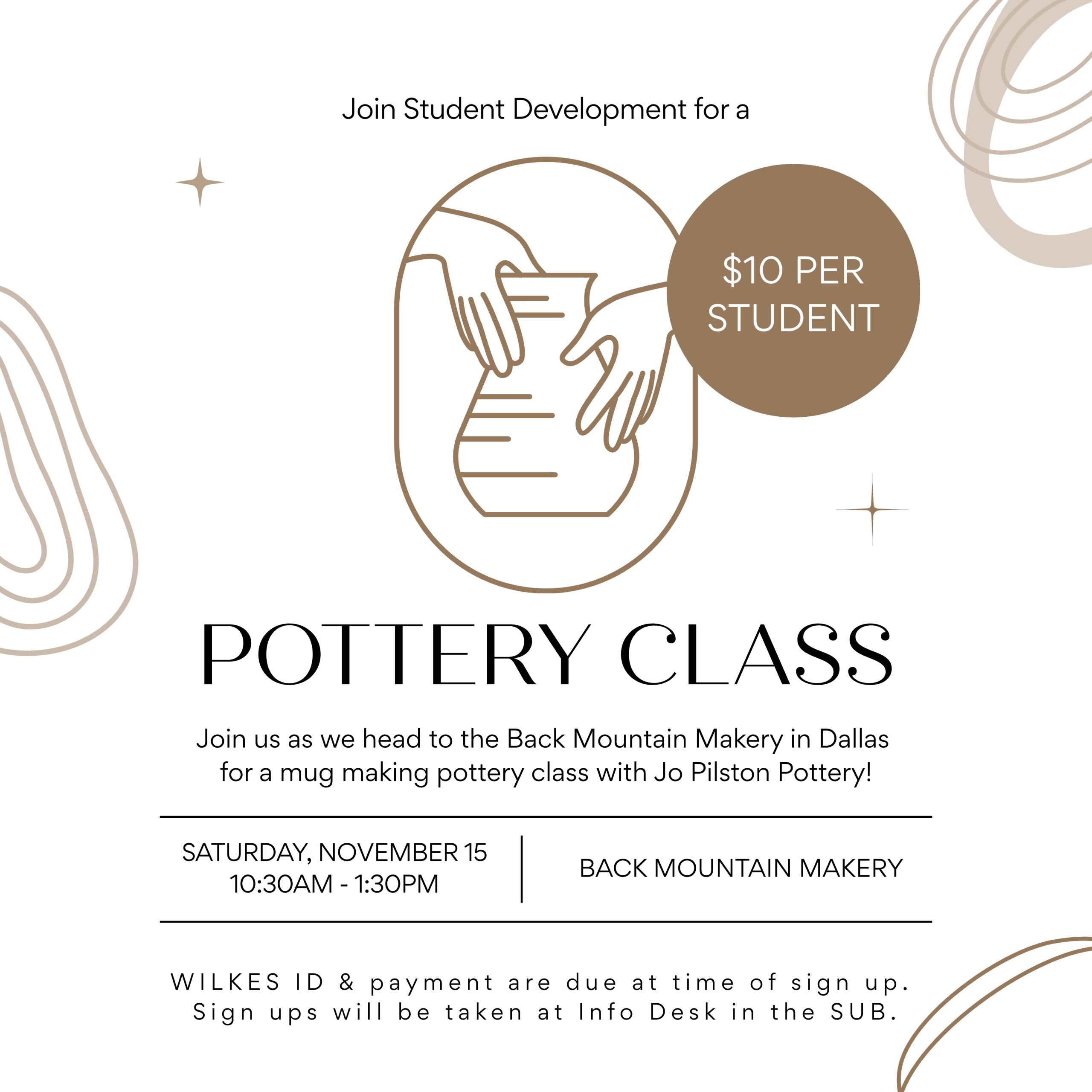 Join Student Development’s Pottery Class at the Back Mountain Makery on Saturday, November 15. Guided by an experienced instructor we’ll partake in a beginner-friendly mug making class where you’ll leave with a piece you made yourself! Wilkes ID and $10 payment are due at time of sign up – stop by the info desk to save your seat. First come first serve!