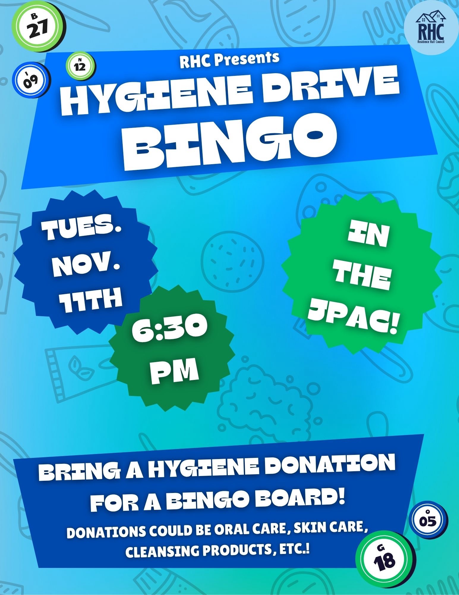 Join RHC on Tuesday November 11th for our Hygiene drive bingo!! Every hygiene product you bring can get you a bingo board! The more products you bring, the more boards you get, the better your chances of winning great baskets filledwith prizes and gift cards to your favorite places! The event will be held in the JPAC at 6:30, and all proceeds will go towards our hygiene drive! |
