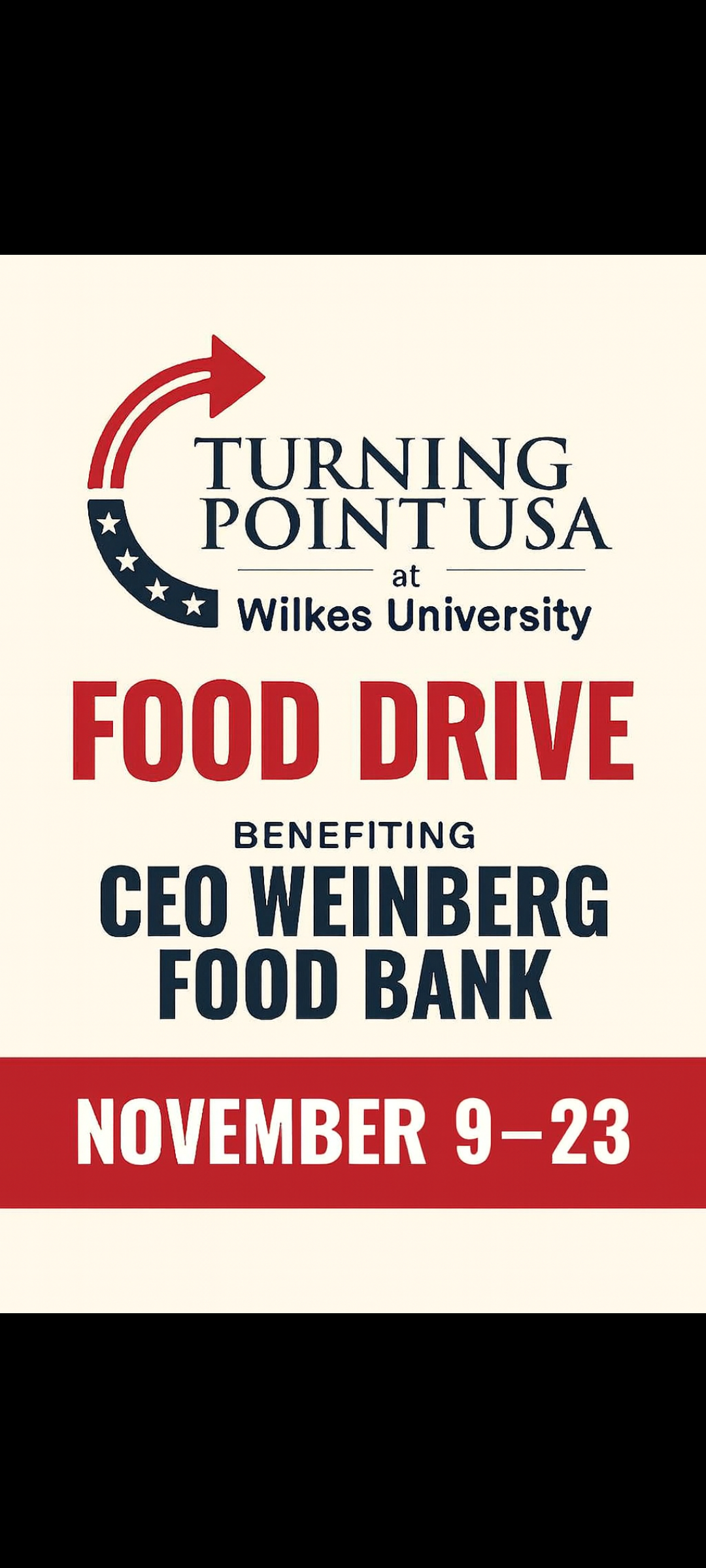 Good Morning. I just wanted to let you know that the Turning Point USA Wilkes chapter will be hosting a canned food drive from the 9th to the 23rd. Our donation bin is located in the SUB. We’re collecting food for CEO Weinberg food bank to help struggling families this holiday season. Hope everyone has a great week.
