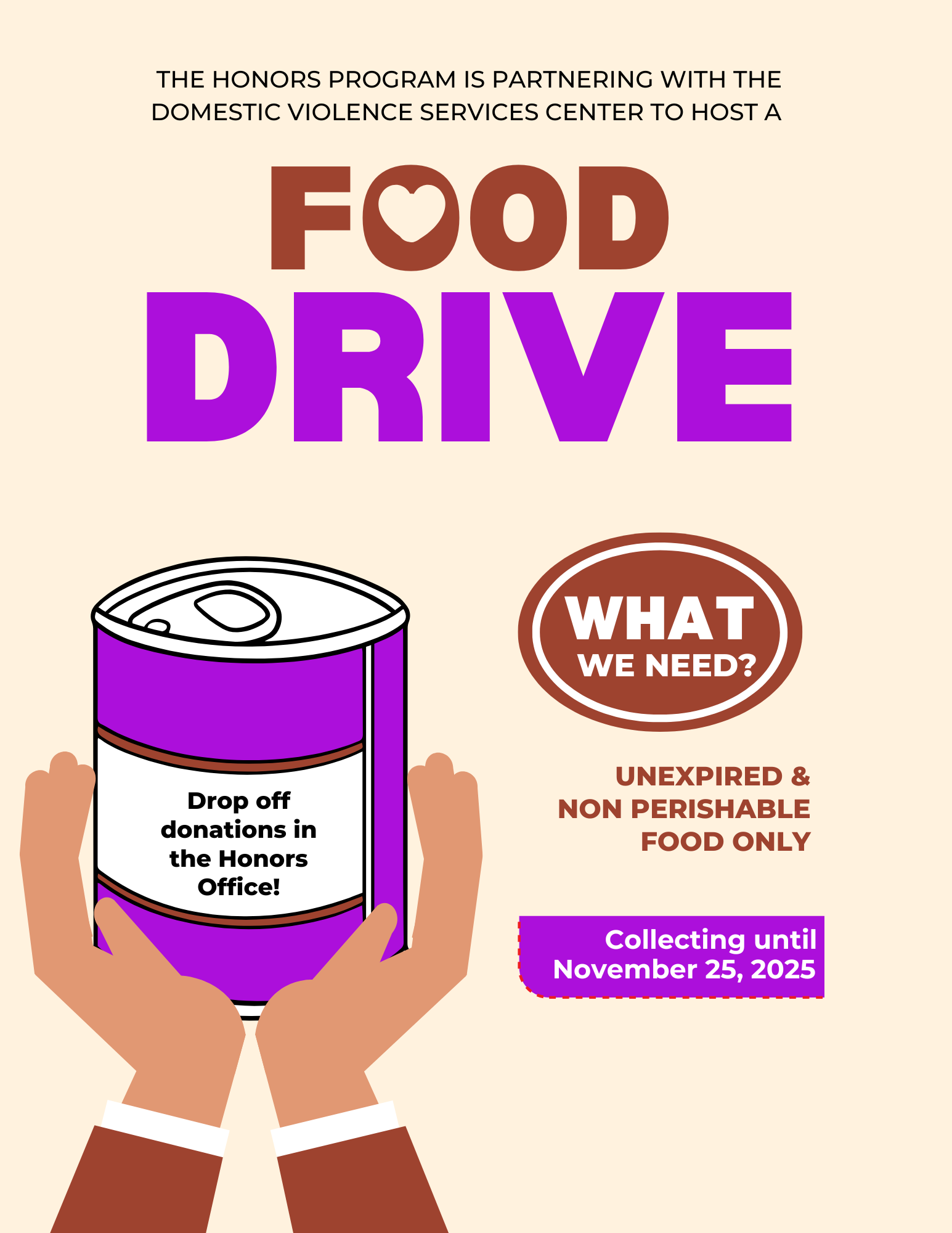 The Honors Program is partnering with the Domestic Violence Services Center to host a canned food drive through the month of November. The donation begins Monday November 10, 2025 and will end on Tuesday November 25, 2025. Scan the QR code located on the boxes so we can keep track of who donated. You may follow the suggested items list or bring in any non-perishable items. Donations can be put in the boxes located in the Honors Office or Honors Lounge!
