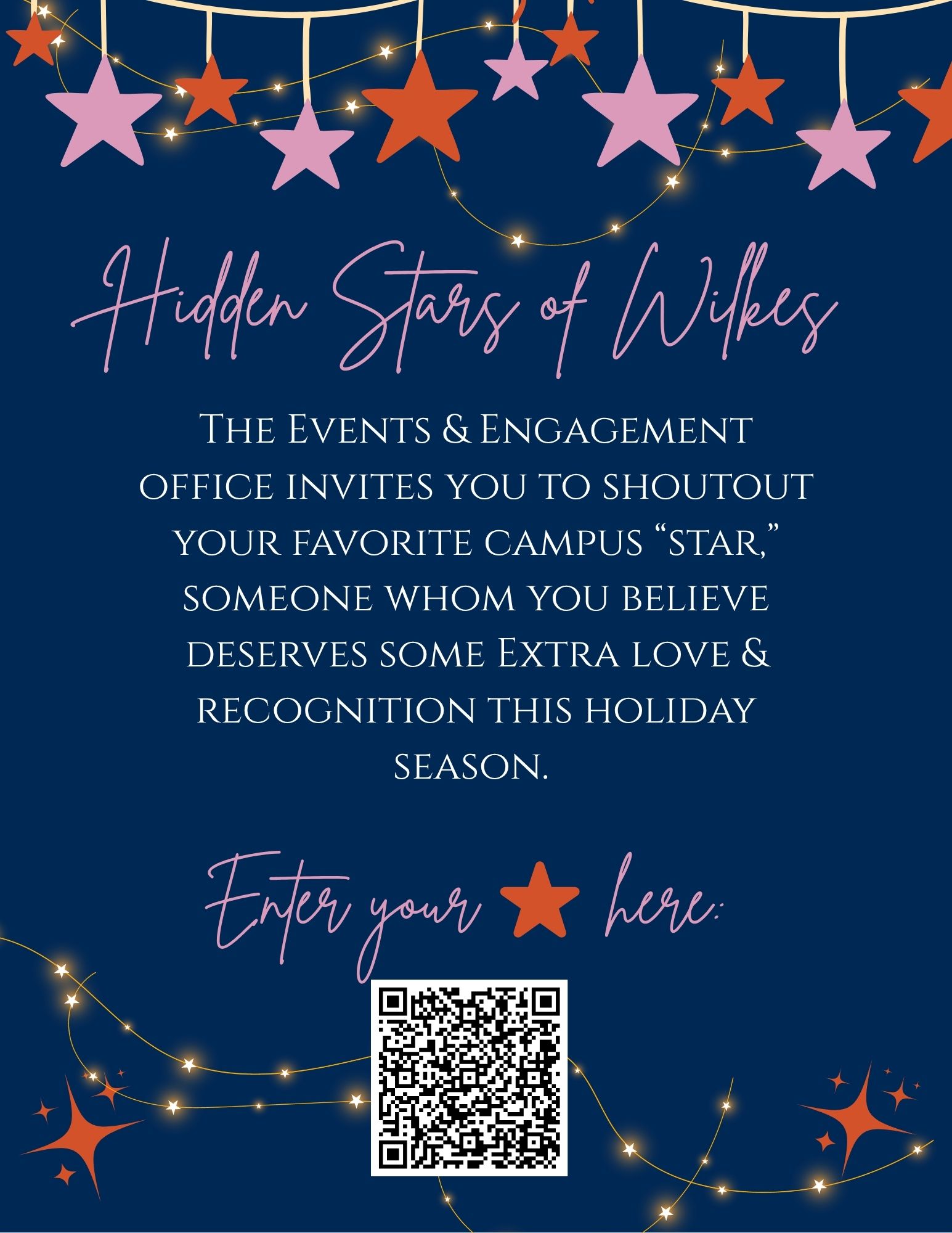 The Events & Engagement office invites you to shoutout your favorite campus “star,” someone whom you believes deserves some Extra love & recognition this holiday season. We will be featuring your “star” on our social media pages, @eventsatwilkes, and those selected to be highlighted will win some Wilkes swag! The holidays can be a stressful and overwhelming time, so it’s crucial our colonel community continues to spread cheer and gratitude.