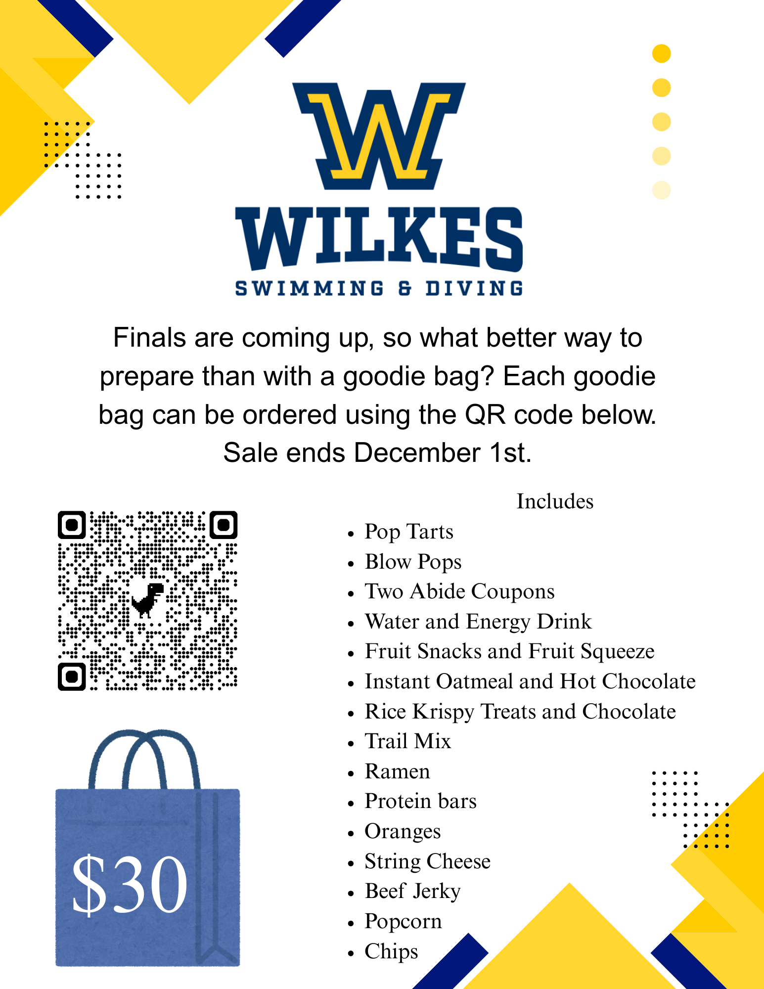 As finals approach, and you need a little pick me up, or a reason to take break… why not delve into a goodie bag delivered to your residence at Wilkes? Sweet treats, bars, some candy and 2 free drink coupons at Abide coffee might do the trick in getting you over the hump while you study and or grade papers