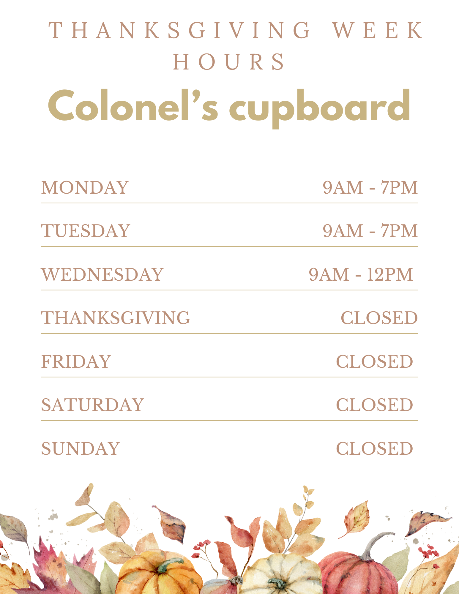 Colonel’s Cupboard is open today from 9-7pm and tomorrow 11/26 from 9-12pm. We are closed Thursday through Sunday for thanksgiving