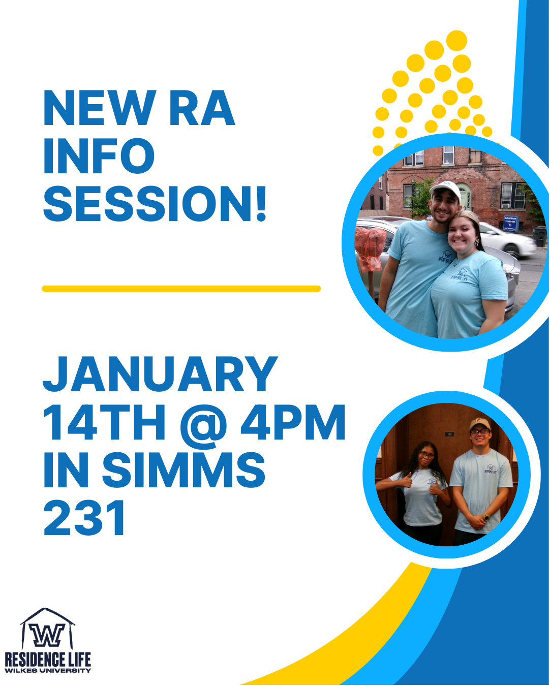 1/14 NEW RA INFO SESSIONJanuary 12, 2026StudentsJoin ResLife for our LAST New RA Info Session on January 14th in SIMMS 231 at 4PM, all you have to do is show up!