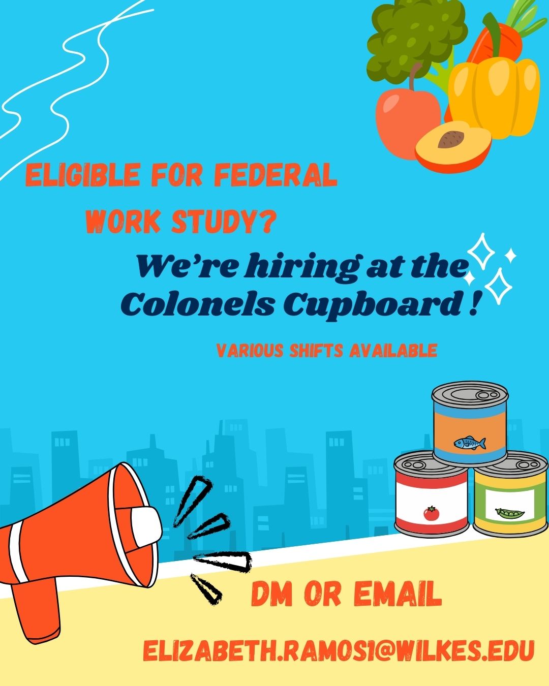 Colonels Cupboard- hiring announcementJanuary 13, 2026January 13, 2026Faculty and Staff, StudentsEligible for work study ? Colonels Cupboard is Hiring Email: Elizabeth.ramos1@wilkes.edu for more details