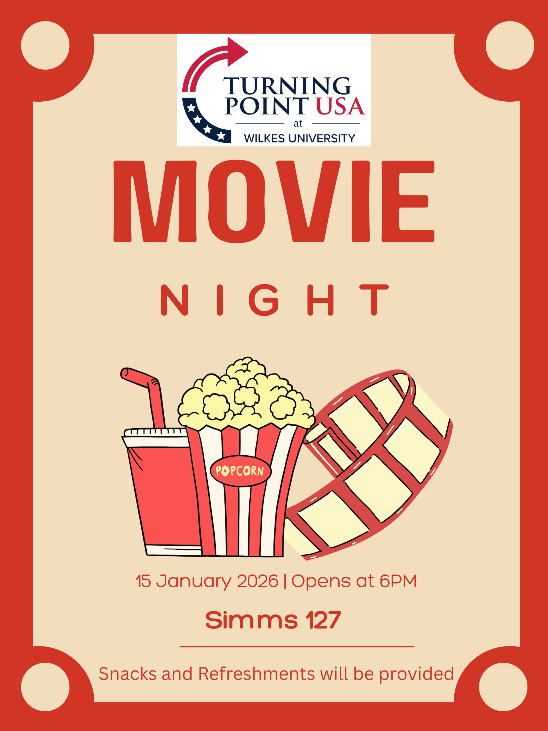 The Turning Point USA chapter at Wilkes will be hosting our first movie night of the semester this Thursday. Take a break from studying to enjoy a movie and snacks. Hope everyone has a great first week.