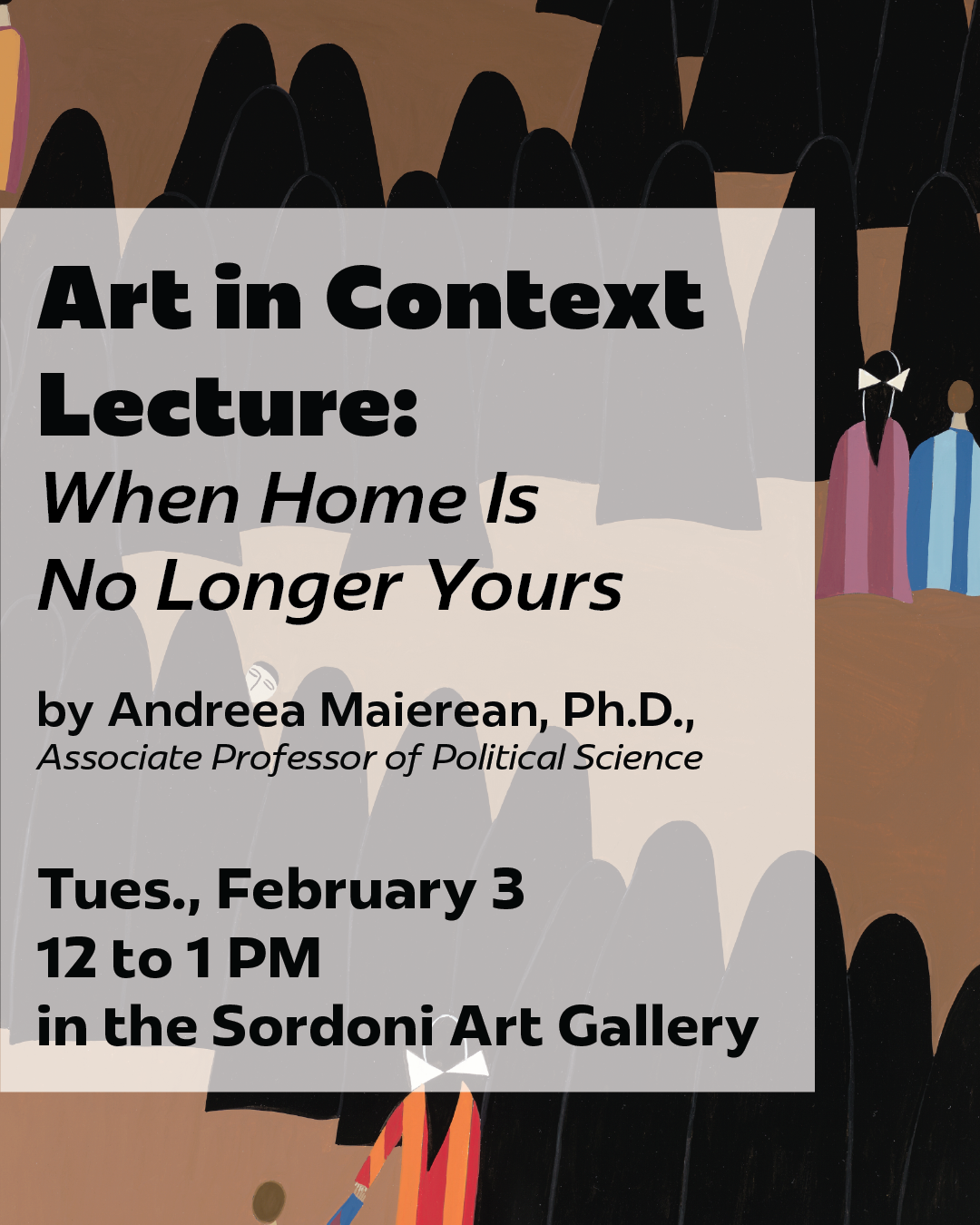 Join us on Tuesday, February 3 at noon at the Sordoni Art Gallery for Dr. Andreea Maierean’s lecture, When Home is No Longer Yours. This lecture shares the title with her essay published in the exhibition catalog. Dr. Maierean shares her grandmother’s experience as a World War II refugee in Romania with a broader analysis of what it means to be forcibly displaced, showing how refuge entails not only the loss of home but also lasting fear, trauma, and a shaken sense of belonging.