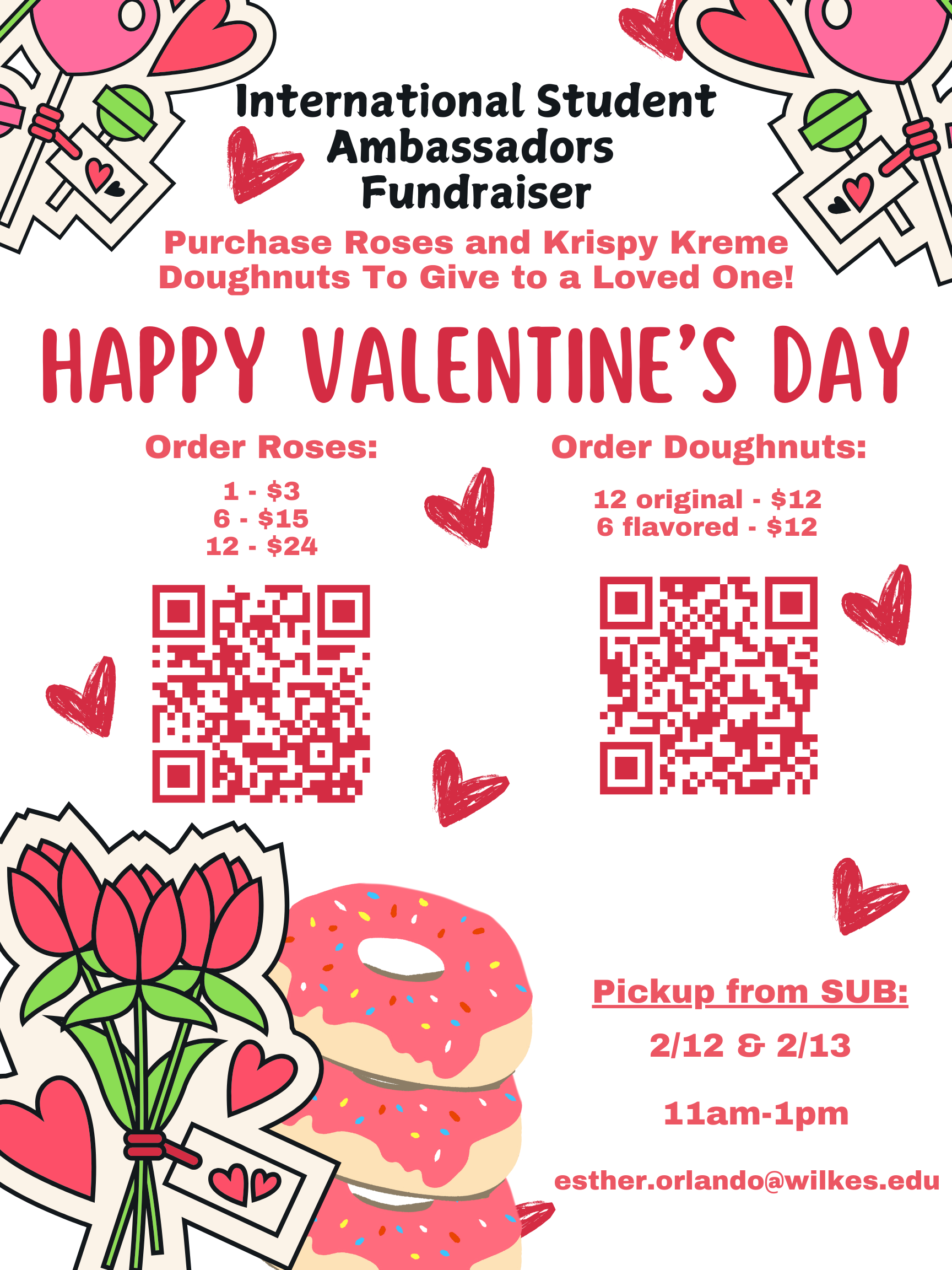 The International Student Ambassadors are running a Valentine’s Day Fundraiser! Scan the QR codes to purchase Krispy Kreme Doughnuts or Red Roses for a loved one. Pick up is on February 12th and 13th. Thank you for your support!