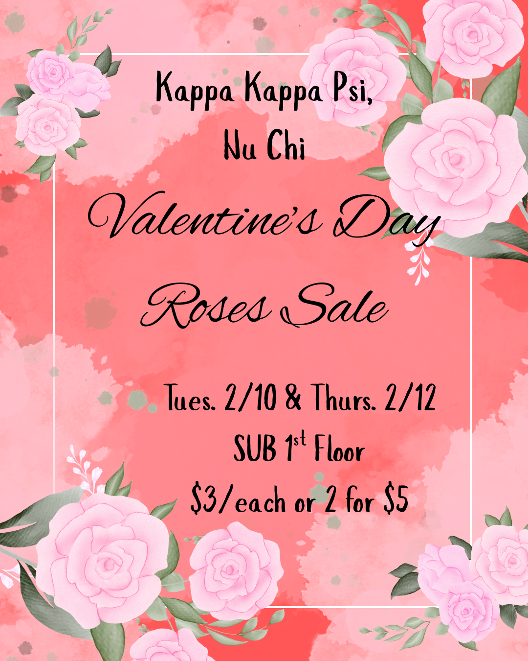 Kappa Kappa Psi, Nu Chi will be hosting a Valentine’s Day Roses Sale during club hours in the SUB! Roses will be sold $3/each or 2 for $5.
