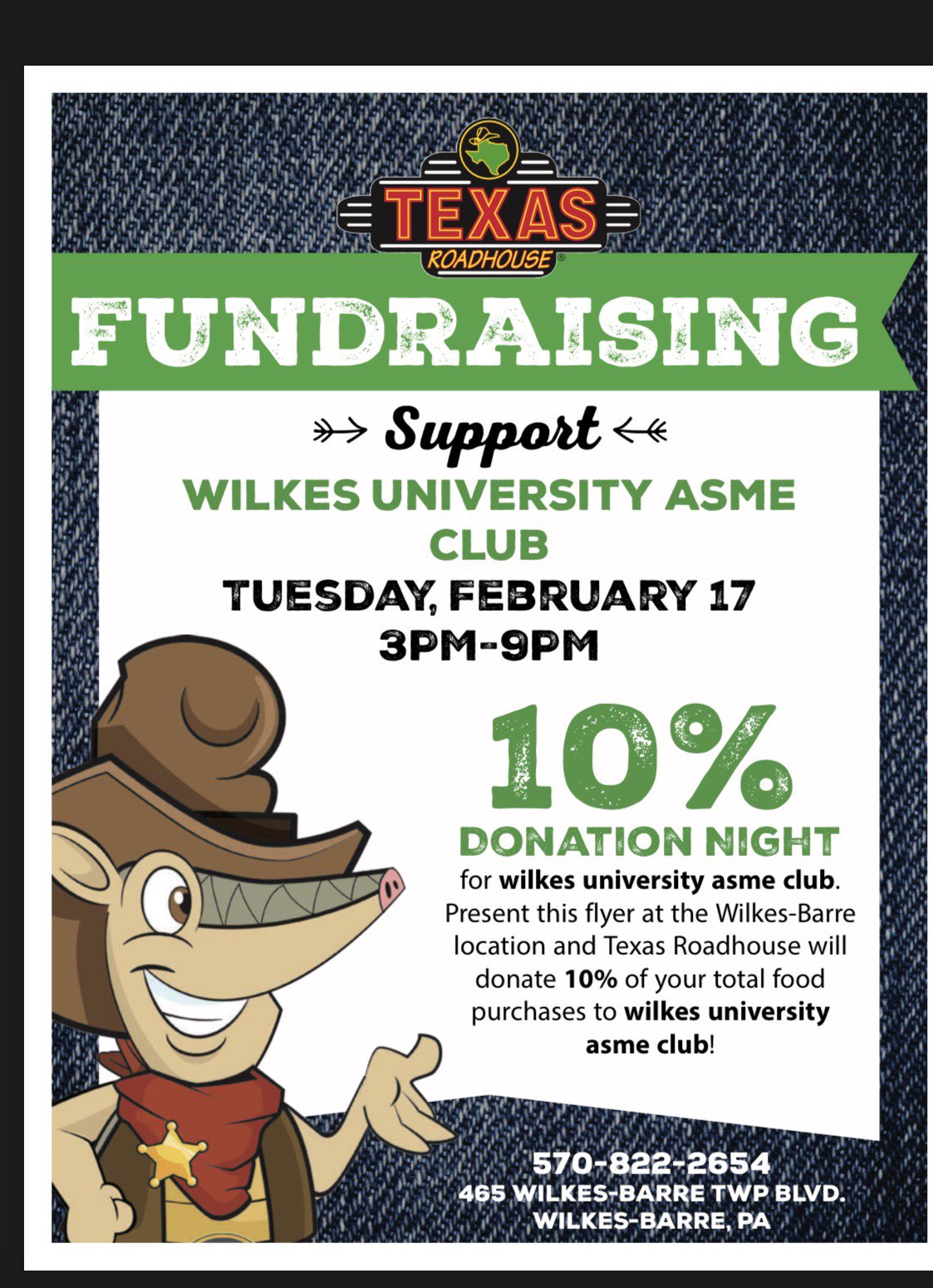 On Tuesday, Feb. 17th, ASME is collaborating with the Texas Roadhouse on Wilkes-Barre Township Boulevard, where if you give them one of our flyers, 10% of your tab will go towards funding the American Society of Mechanical Engineers Wilkes Chapter. These funds will go towards one of the most renowned charity events in the Wilkes-Barre area, the Annual ASME Car Show! We would love to count on your support in helping grow the greatest Mechanical Engineering club on campus!