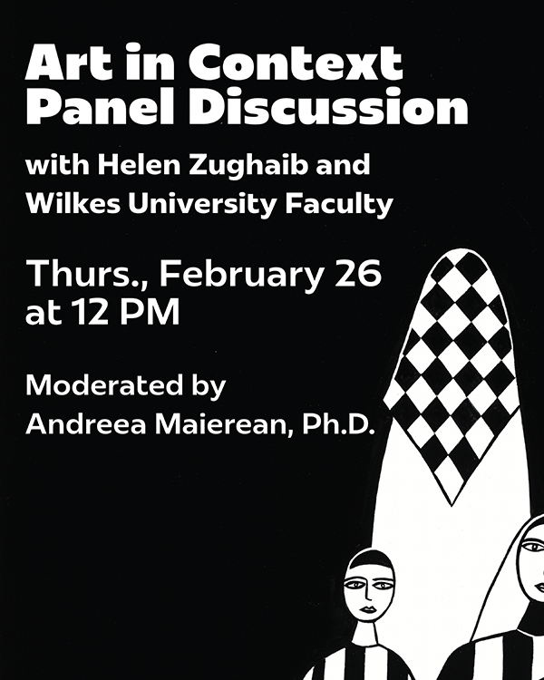 Dr. Andreea Maierean will moderate a panel discussion exploring immigration stories as they intersect with art, lived experience, and scholarly inquiry. The conversation will feature exhibiting artist Helen Zughaib alongside Wilkes University faculty, bringing together artistic, cultural, and academic perspectives on migration, displacement, and identity.