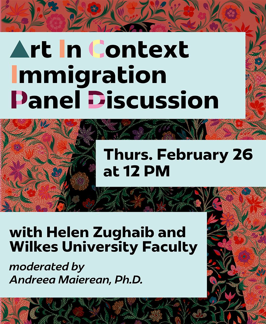 Dr. Andreea Maierean will moderate a panel discussion exploring immigration stories as they intersect with art, lived experience, and scholarly inquiry. The conversation will feature exhibiting artist Helen Zughaib alongside Wilkes University faculty, bringing together artistic, cultural, and academic perspectives on migration, displacement, and identity.