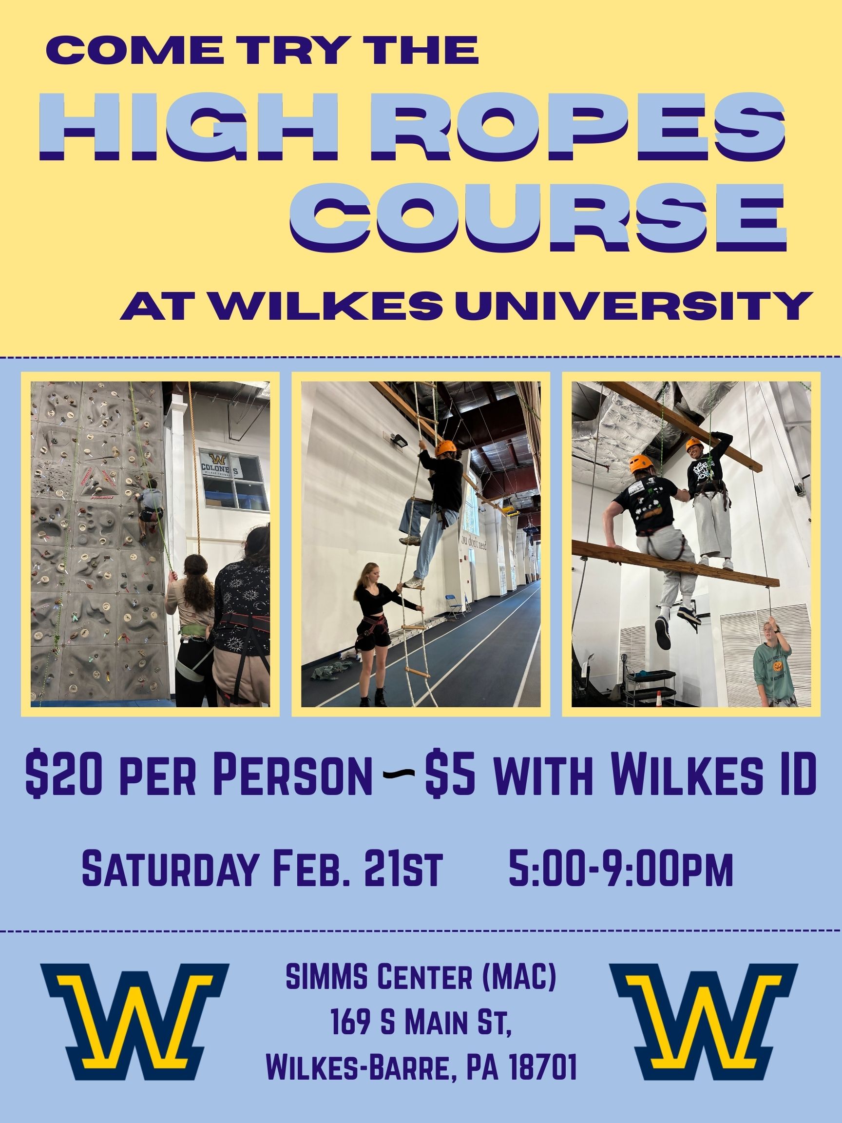 | The entire high ropes course in the MAC will be open to students, staff, and the public on Saturday Feb. 21st from 5:00-9:00pm. This event will be ran by Wilkes Adventure Education. The event will cost $20 per person or $5 with Wilkes ID. |