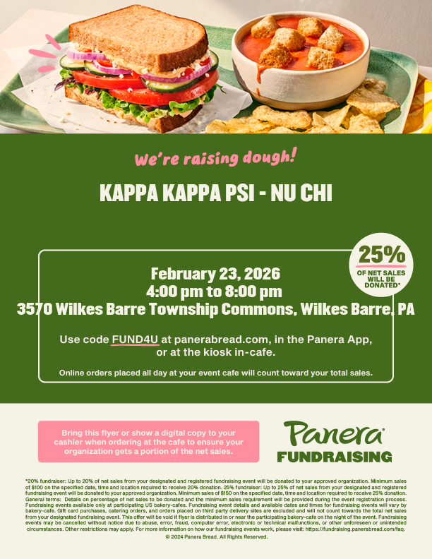 Kappa Kappa Psi is hosting a fundraiser at Panera Bread in Wilkes-Barre today from 4-8pm. Please stop by and use the code FUND4U or mention this fundraiser to the cashier. Thank you!