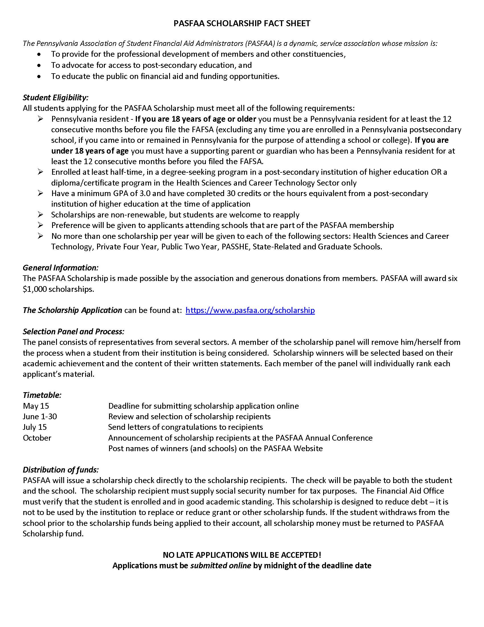 The Pennsylvania Association of Student Financial Aid Administrators (PASFAA) is offering a Scholarship opportunity for Pennsylvania resident students! See Flyer Attached for details about qualification, application, and timeline!