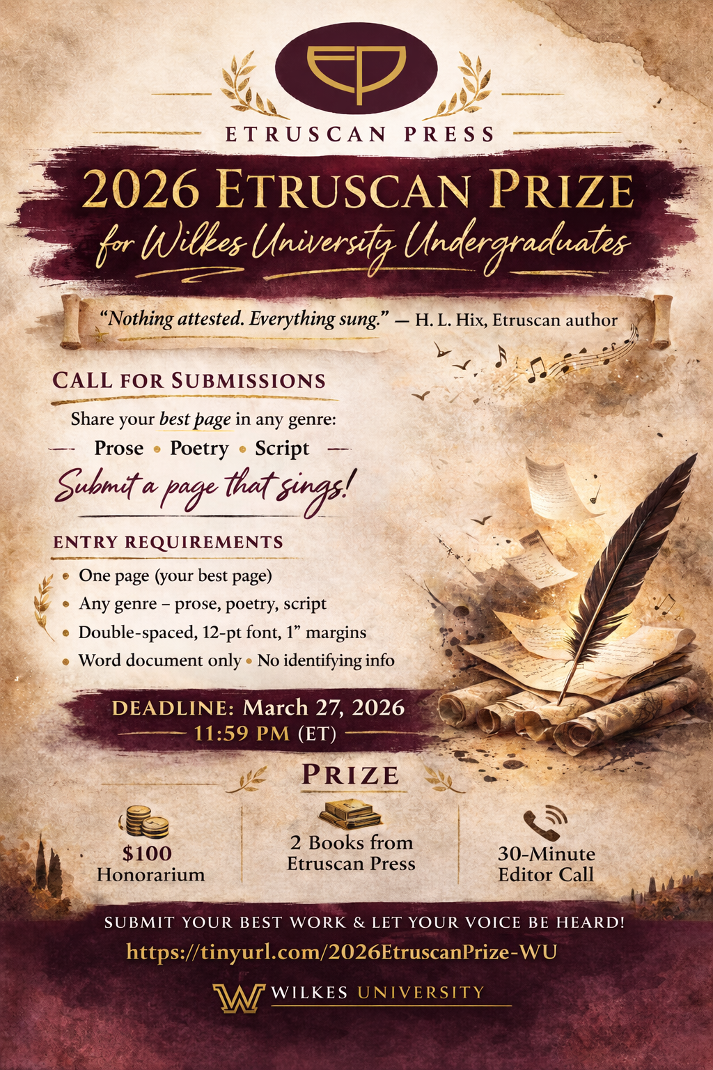 This year’s undergraduate creative writing competition hosted by Etruscan Press is live. Students are invited to submit one page of their best work at https://tinyurl.com/2026EtruscanPrize-WU . The winner will receive a $100 honorarium, two free books from Etruscan, and a 30 minute call with one of our editors about how to move forward with getting your work published.