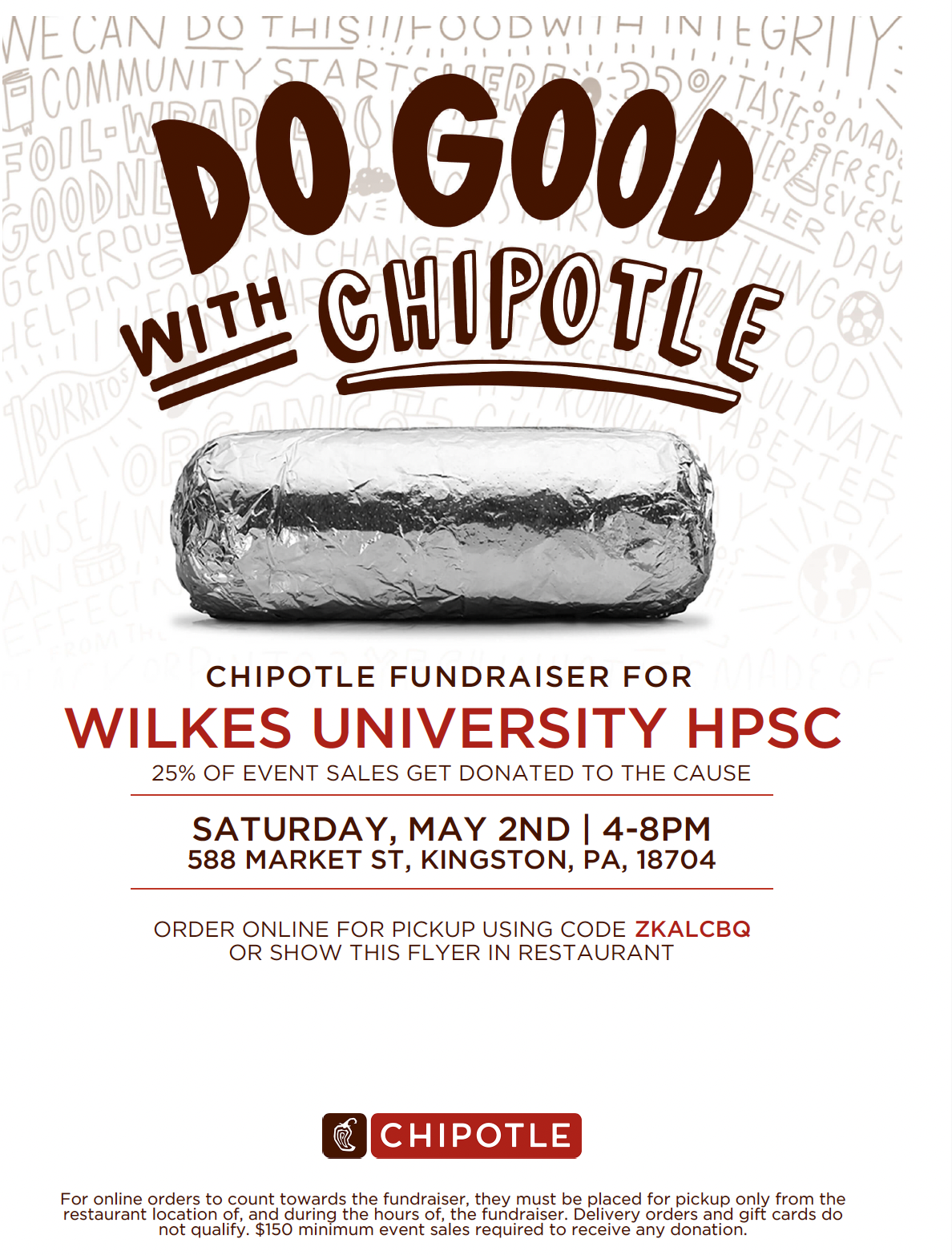 | Take a break from finals on Saturday, May 2 and come out to the Chipotle across the bridge in Kingston! 25% of all sales go towards the HPSC. Send a picture of you with your food to the Honors Instagram the day of the fundraiser to be entered for a chance to win a gift card. |