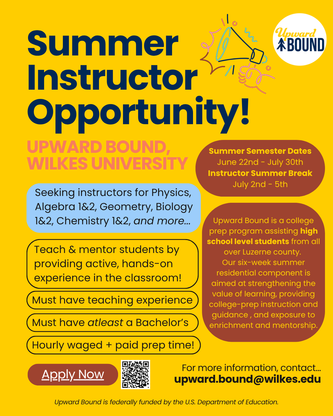 TRIO Upward Bound (UB) at Wilkes University is hiring for its 2026 six-week summer program!