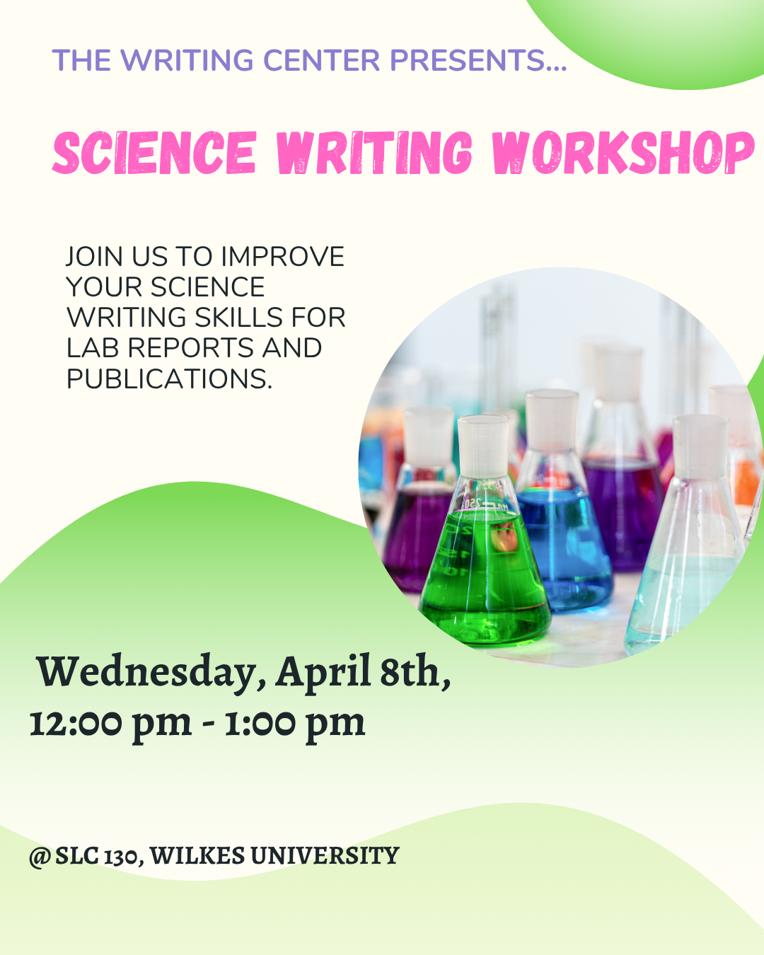 The Writing Center is excited to organize its second Science Writing Workshop of the semester! All students are welcome to attend the event on Wednesday, April 8th 12-1pm in SLC 130 to learn about useful tips for science writing.