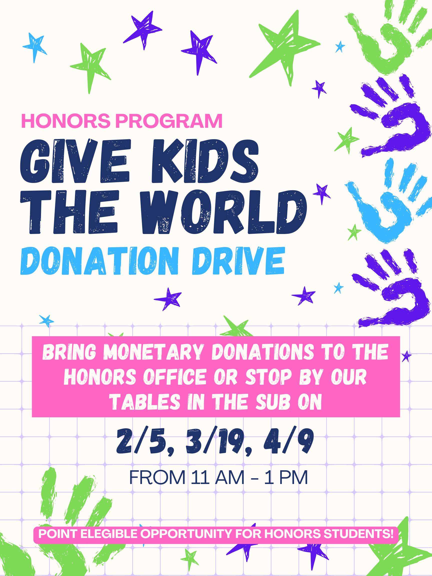 The Honors Program is collecting cash donations to benefit Give Kids The World, a nonprofit that provides memorable vacations for children with critical illnesses and their families. Every dollar makes a difference in helping these kids experience joy and hope.