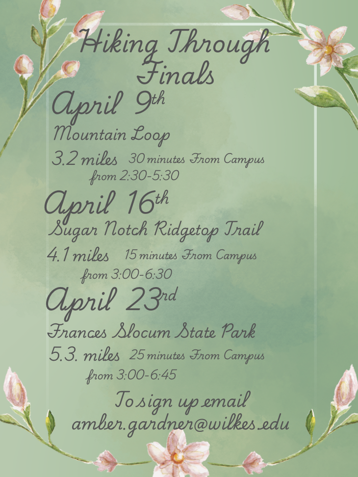 If you need a break from classes and a chance to get into nature, come with the Wilkes Adventure Education club on our series of hikes. This week (4/9) we are going to Nescopeck State Park to hike the Mountain Loop which is 3.2 miles. Transportation will be provided, please email amber.gardner@wilkes.edu to reserve your spot.