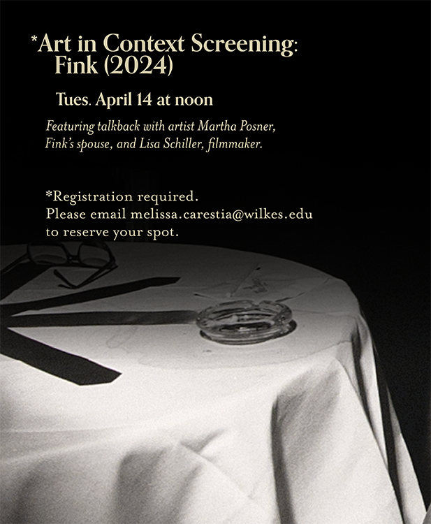 Join the Sordoni Art Gallery on Tues. 4/14 at noon for this event. This screening features a special talkback session with artist Martha Posner, Fink’s spouse, and Lisa Schiller, filmmaker.