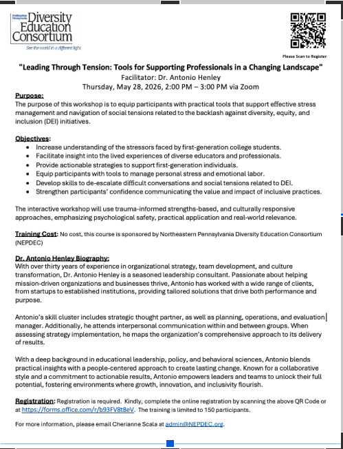 NEPDEC is hosting a workshop titled Leading Through Tension: Tools for Supporting Professionals in a Changing Landscape. This interactive session will be facilitated by Dr. Antonio Henley on May 28, 2026, from 2:00–3:00 PM via Zoom.