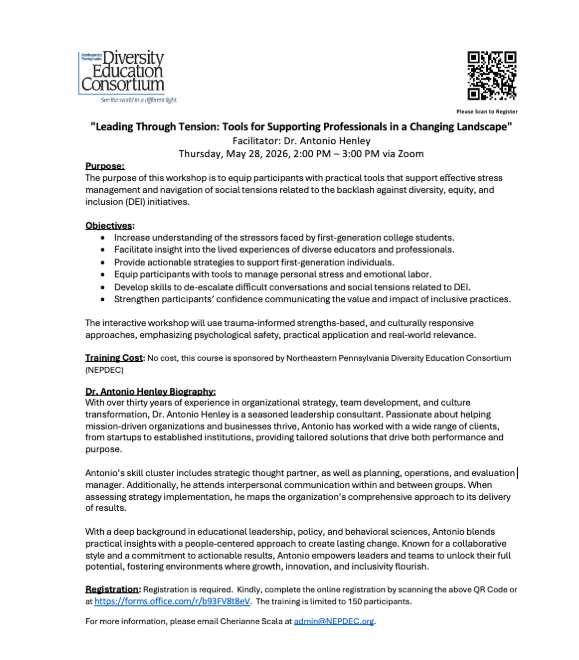 NEPDEC is hosting a workshop titled Leading Through Tension: Tools for Supporting Professionals in a Changing Landscape. This interactive session will be facilitated by Dr. Antonio Henley on May 28, 2026, from 2:00–3:00 PM via Zoom.