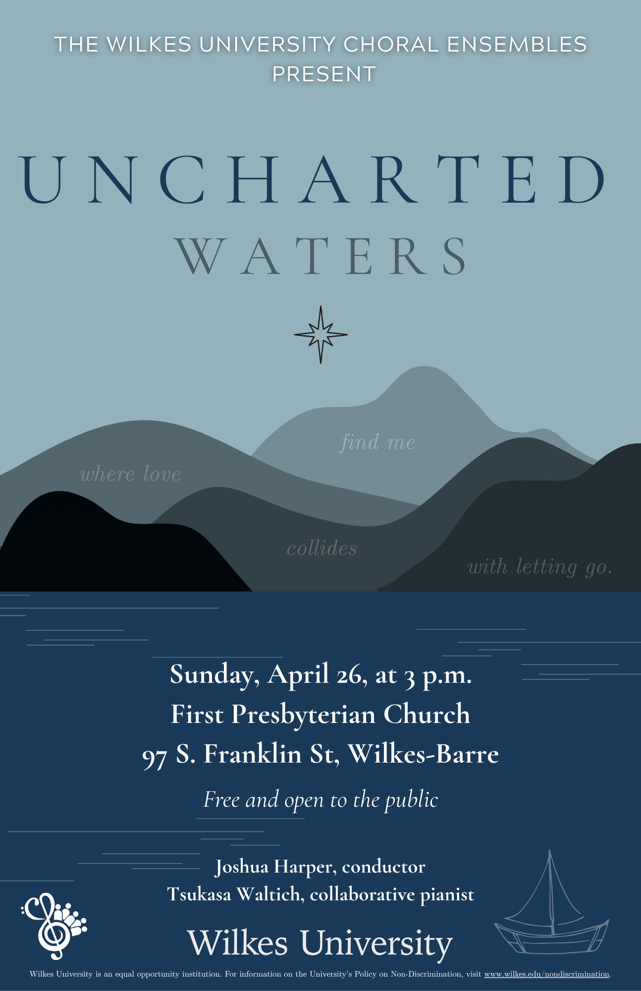 This Sunday at 3PM at First Presbyterian Church the Wilkes University Choral Ensembles will perform their free concert, Uncharted Waters, featuring works by Jennifer Lucy Cook, Eric Whitacre, Ola Gjeilo, and more!